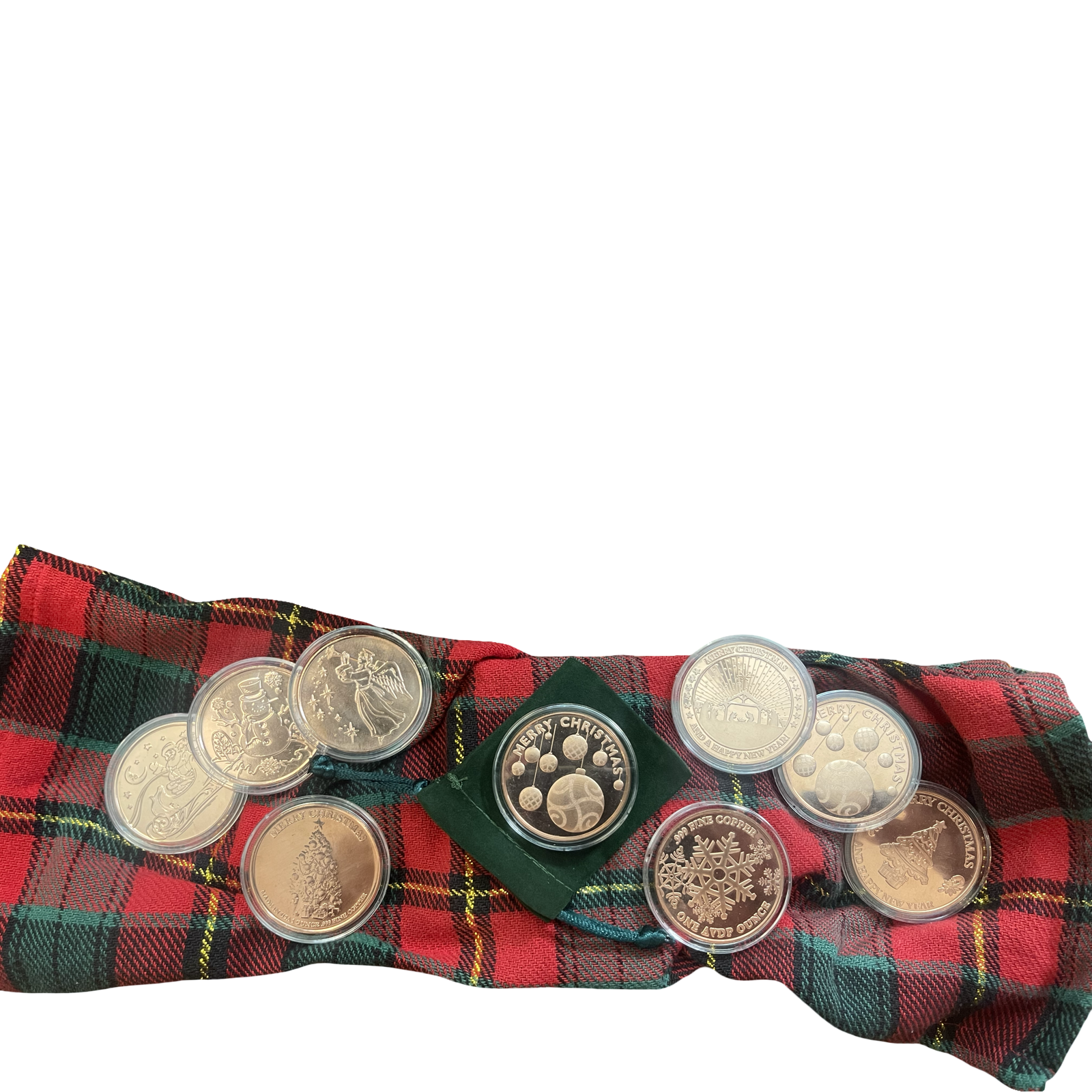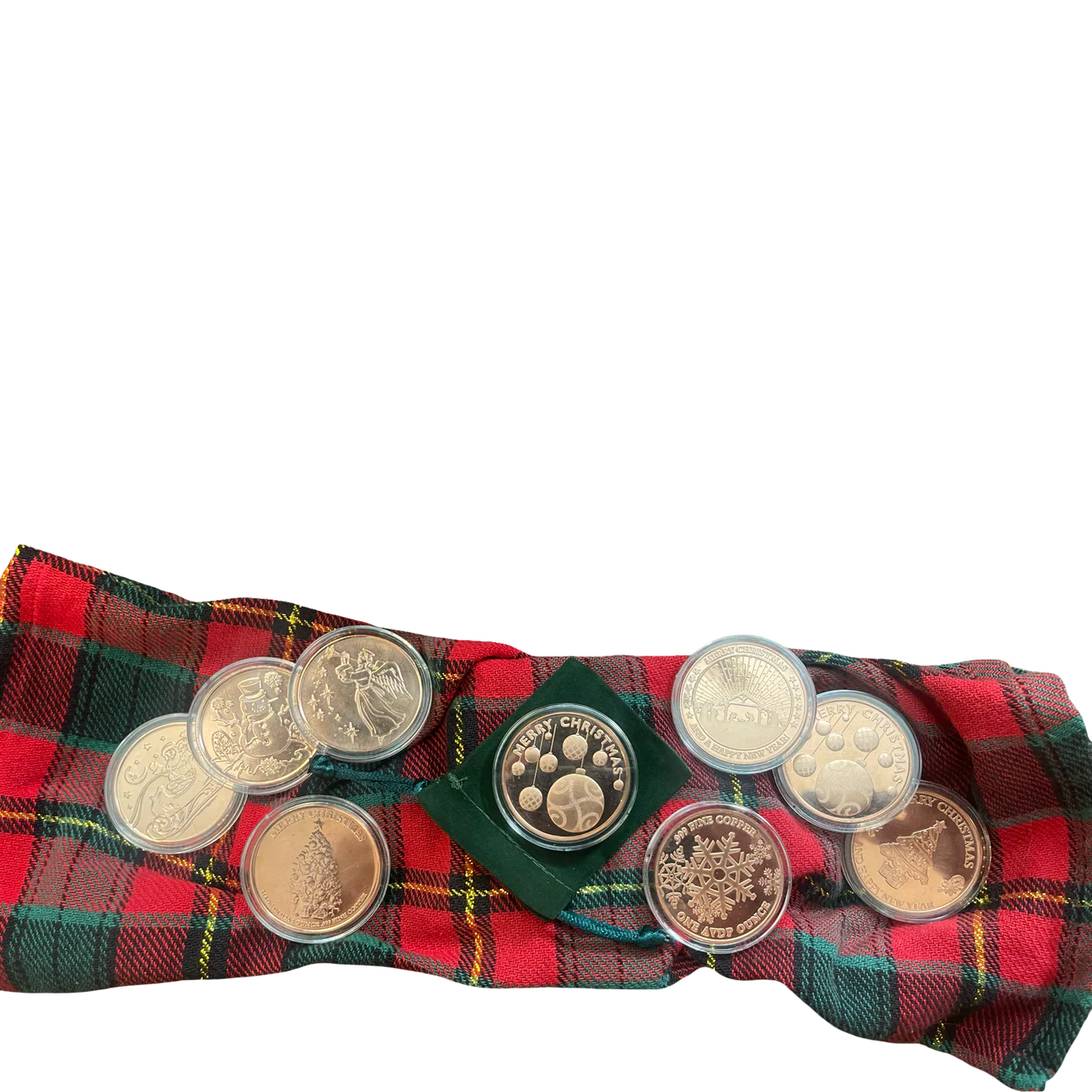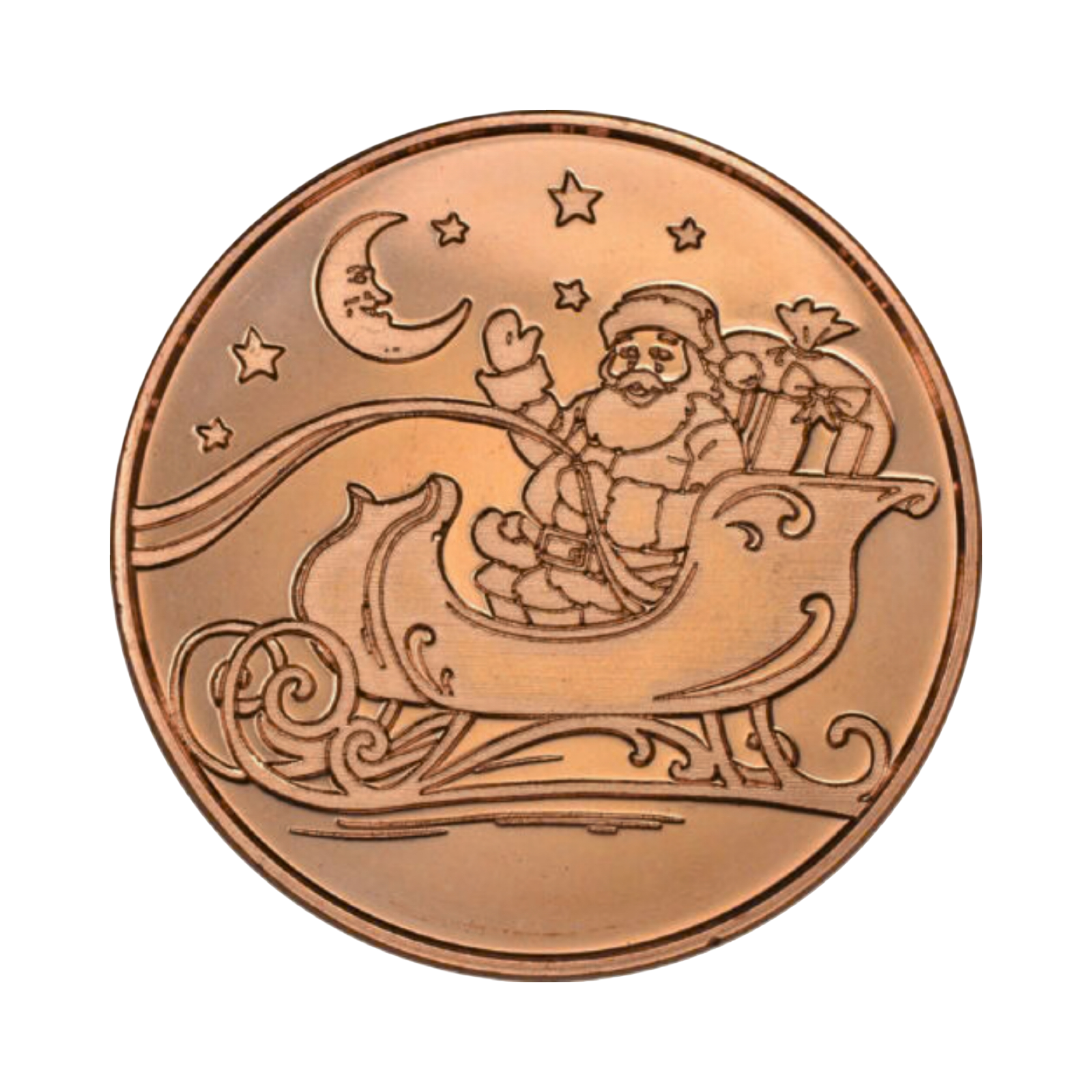 Celebrate the season with our .999 Copper Christmas Medallions — One-ounce collectibles that feature festive designs on both sides! Perfect stocking stuffers, these medallions appeal to collectors and gift-givers alike. Each copper round includes a protective capsule and green velvet pouch. Available in six varieties. Complete the collection by taking advantage of our late-season offer: buy 5 medallions - receive one free! You'll get the complete Christmas collection, including capsules and pouches, all for $25. A sophisticated yet affordable way to spread holiday cheer.