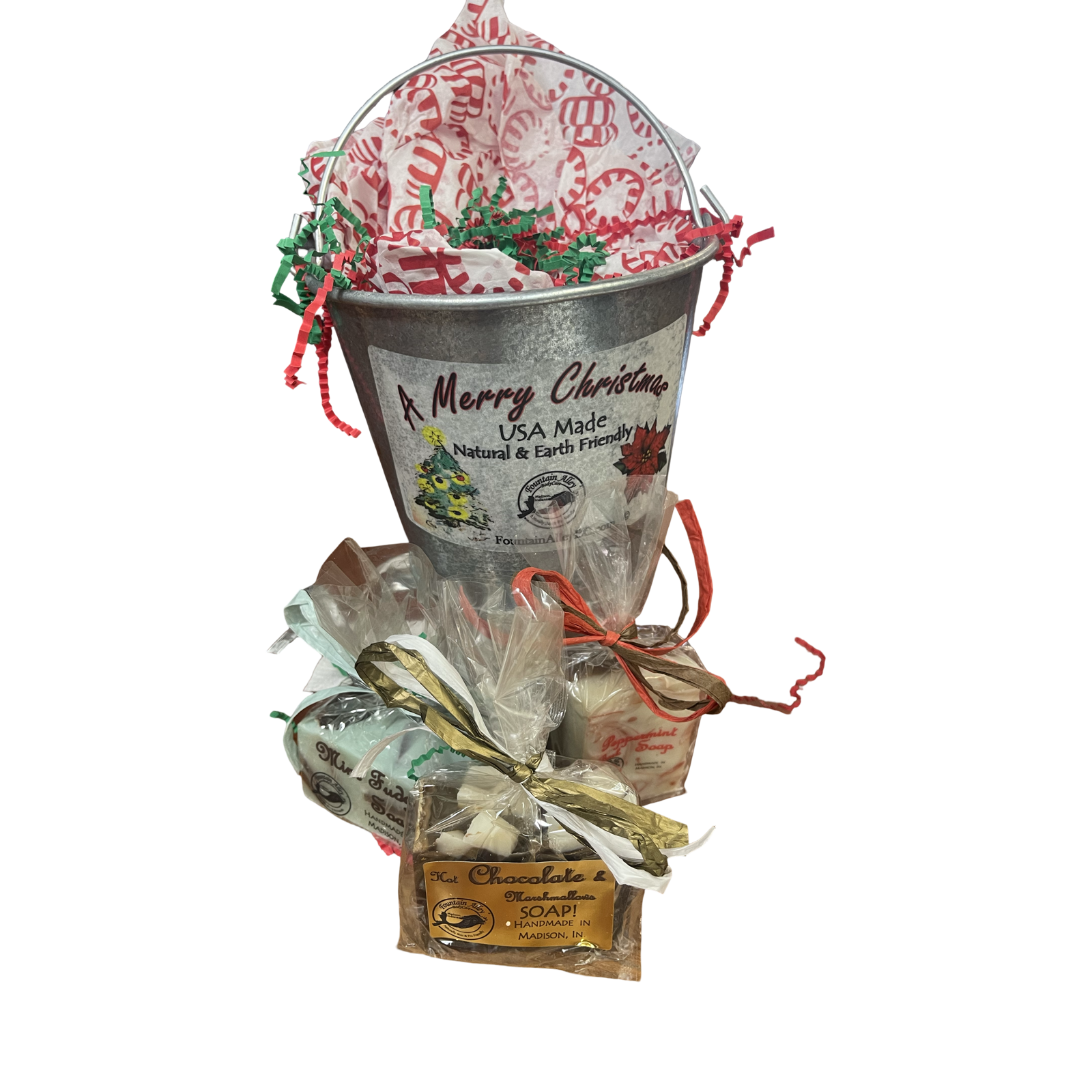It's like getting a bucket of candy. You receive 3 of our Holiday Soaps-Mint Fudge Soap, PepperMint Bark Soap, and Hot Chocolate & Marshmallows Soap. Of course they're all natural and great on the skin, makes a great gift with the reusable USA bucket. All USA made with global sourced oils. Packaging all USA.